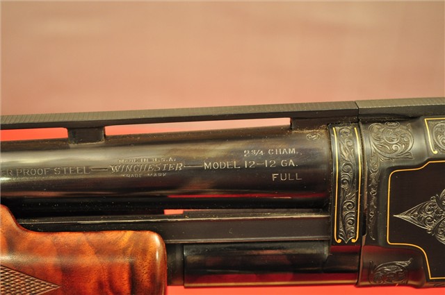 Model 12 chambered in 12 gauge 2 3/4 and full choke. It has a 28 inch barrel. It has a vent rib.
