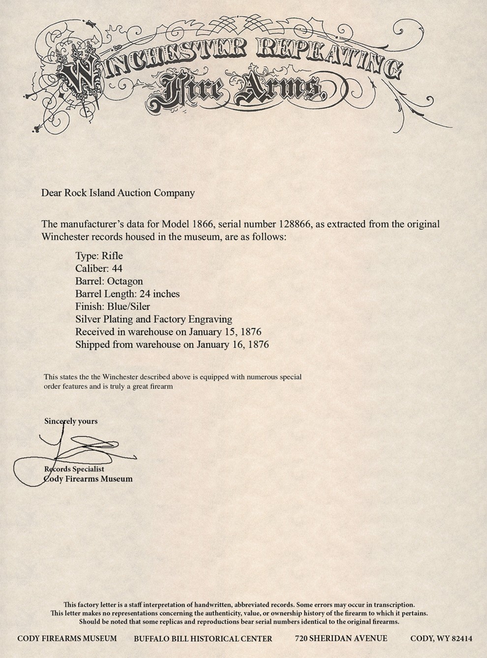 The accompanying Winchester factory letter confirms rifle, silver plating and