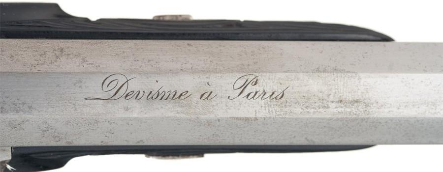The pistol has a bead front sight and a fixed notch rear sight. The top barrel flat is script marked "Devisme a Paris" and the bottom flat at the muzzle is marked with the serial number "2147".