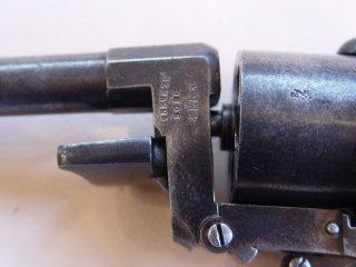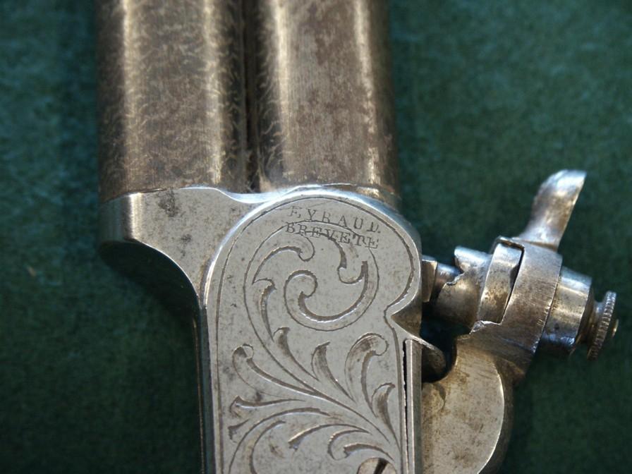 Singer, Pistolets et Revolvers de poche aux XIXeme siecle. Page 30 and 31. Jean Baptiste Eyraud est un inventeur d'un certain nombre de brevets pour armes a répétition, actifs rue Etienne 1825-1860. Il a copié un brevet de Rigby, remplaçant le disque tournant par un bras tournant évitant de ce fait le plagiat. Sur les deux canons on commute seulement entre les deux mais le système peut également travailler avec quatre canons dont voici un exemple.