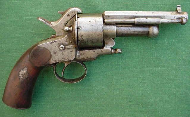 Brevet français du revolver à tourelle de 1865. Cet inhabituel modèle fonctionne par pression sur la détente repliable double action, ce qui soulève puis laisse tomber un percuteur latéral sur la cartouche de fulminate et également fait tourner la tourelle à dix coups. En ouvrant une grande plaque du côté gauche, le cylindre peut être rapidement retiré pour le chargement ou le remplacement avec d’autres. Le canon porte du côté gauche la mention "J. F. Gouery Canat et Co. Paris "et du côté droit " Systeme A. Noël ". L'armature est maintenue en blanc comme c’était souvent le cas à l’époque et est entièrement gravée de rouleau et équipé des poignées découpées en deux en noyer. Le numéro de série est 28, le calibre est approximativement 7.5mm.