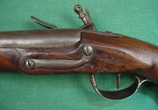 Pistolet militaire à silex de la révolution française des environs de 1800. Marquage d’inspection et marquages L.M.S. ( ??). Marquage illisible sur la crosse.