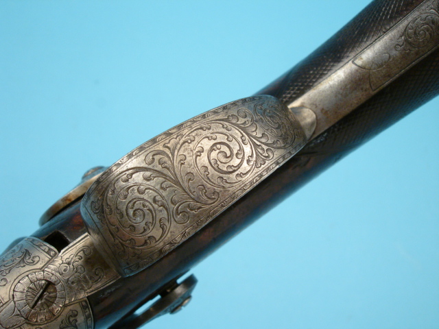 Calibre .69, canons rayés de 7 pouces superposés marqués: Pottet à Paris. Marques d’épreuve belge sur le côté gauche. Baguette de nettoyage en acier. Double détente. Chiens, carcasse, platine, garde de détente et extrémité de crosse gravés de rouleaux. Même les vis sont gravées. La crosse quadrillée est en noyer avec à son extrémité un petit réceptacle avec couvercle pour les capsules. Curieusement cette arme possède un anneau de lanière.