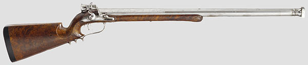 Légèrement gravé avec un set de détente double et une sûreté d’armé. La plaque de platine est signée "Les Soissons à Grenoble". Bois de noyer et plaque de couche foncée. Accessoires en fer. Les plaques latérales finement gravées ont des écrous papillons pour démonter rapidement la platine. Longueur : 108.5 centimètres.
