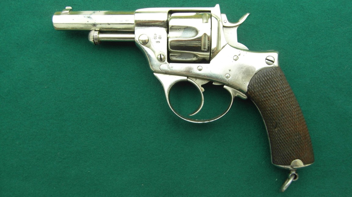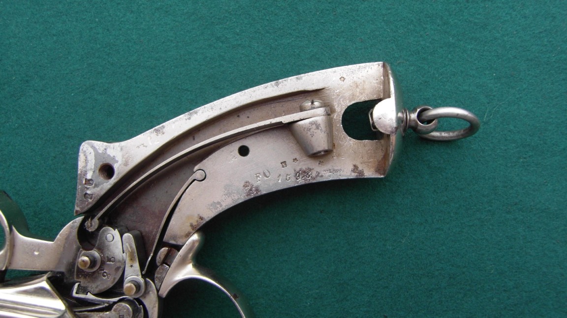 9mm pinfire, 5-shot rd. cyl., 6 1/4" rd. and octagonal barrel. The barrel retains a post front sight and the hammer is notched for the rear sight. This fine pistol is finished in the white with relief factory engraving on the barrel, frame, back strap, hammer, etc. and is fitted with a lanyard ring in the butt stock. Two-piece ivory grips. The pistol is cased in a French style fitted case of maroon velour interior. Brown leatherette exterior. The interior has a small compartment with gold and ivory handle and 12 holes for cartridges.