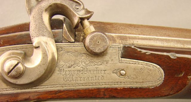 The lockplate is marked "Henry Parker/Warranted". Perhaps the product of Henry Parker Trenton, N.J. as Weindbrenner was known to travel to Buffalo, N.Y. to purchase parts. He would leave Chippawa at 3 a.m., walk 15 miles to Ft. Erie, cross the Niagra River by ferry, purchase his supplies and return the same day, walking. Several of the inlays on this rifle were purchased from catalogues of the time.