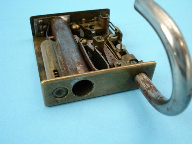 .38 caliber, the brass padlock alarm gun with complicated lock mechanism that fires the gun by the depressing of the hasp. Marked on bottom: Will & Finck/S.F. Cal.
