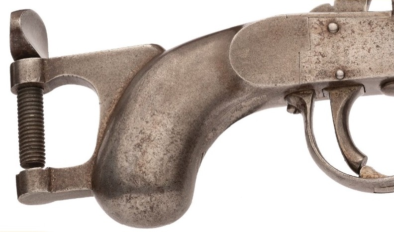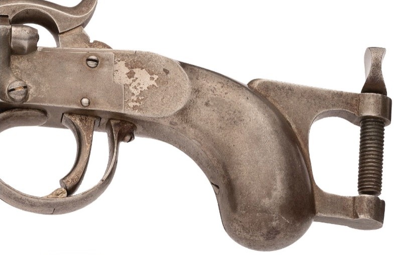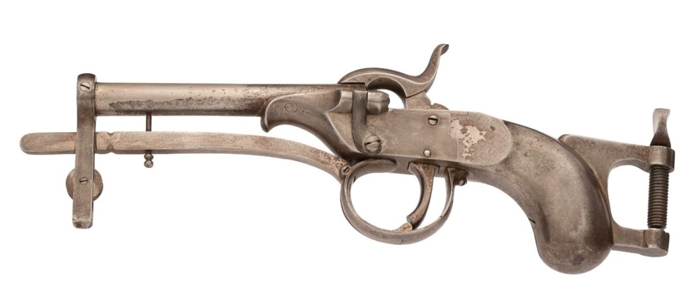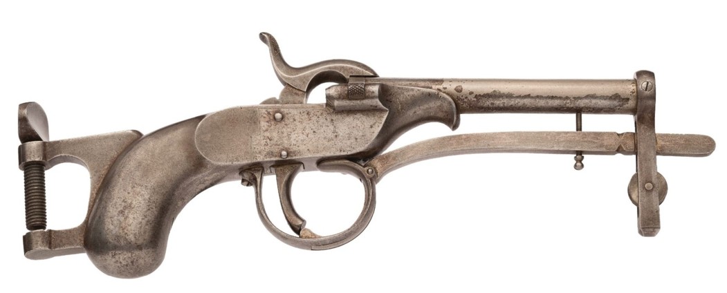 À la page 114, figure 115, du livre « Firearms Curiosa » de Lewis Winant. 112, il est indiqué : « …peut être fixé par sa bride à tout support approprié.